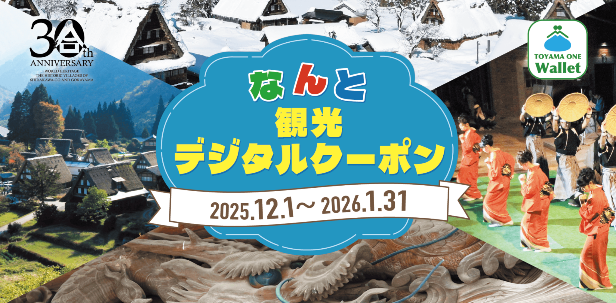 これを機に南砺市では、さらなる観光客の誘致と地域の活性化を図るため、市内宿泊施設に宿泊いただいた皆様、またレンタカーで南砺市を訪れる皆様を対象に「なんと観光デジタルクーポン」を配布します。