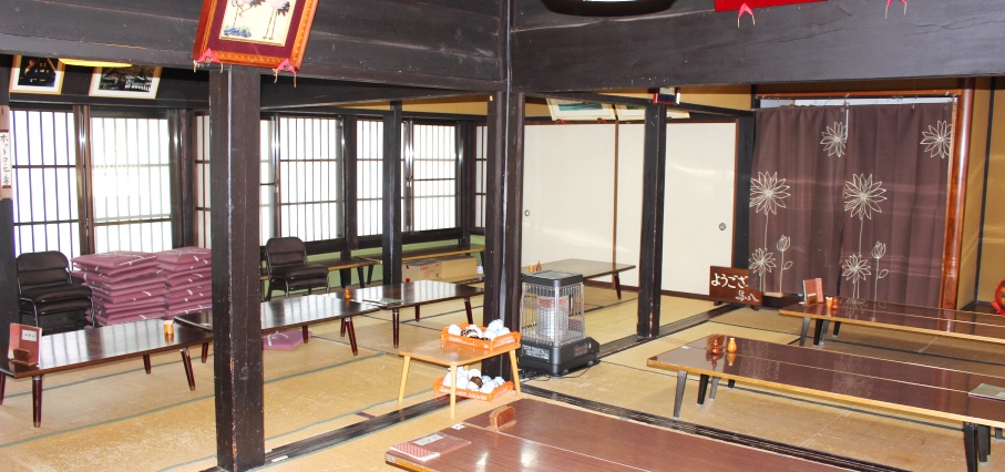 ー 食事処・お土産 与八 ーRelax and enjoy seasonal tempura, char fish, and Gokayama tofu while looking out over the Gassho-zukuri houses.